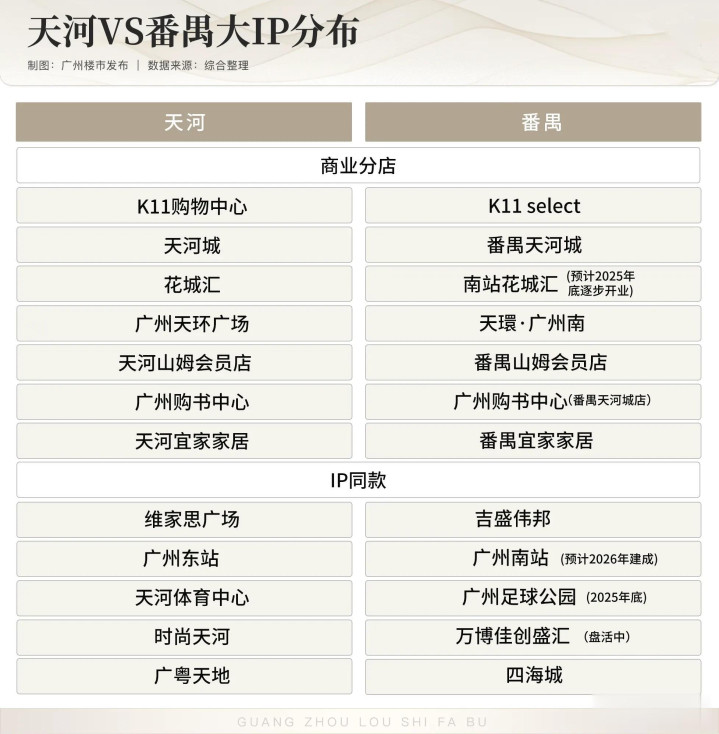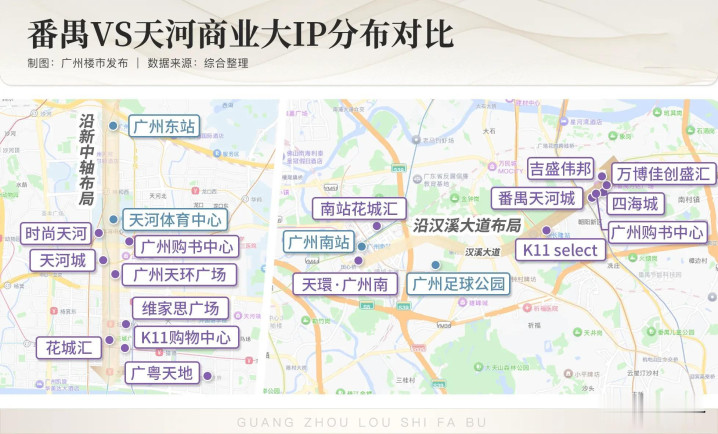 就拿番禺和天河的商业来说,番禺的商业IP沿着汉溪大道分布,与天河商业IP沿新中轴分布,如出一辙。